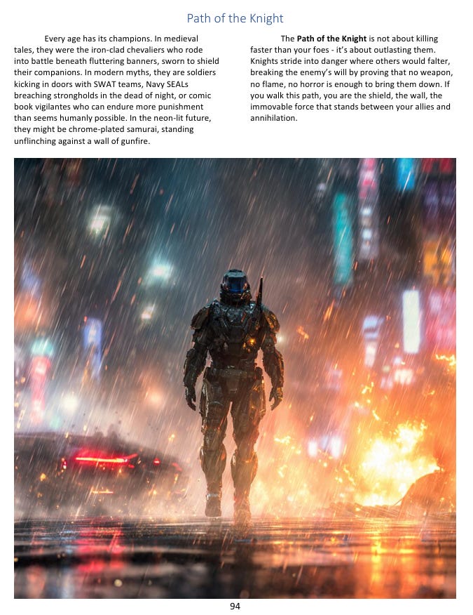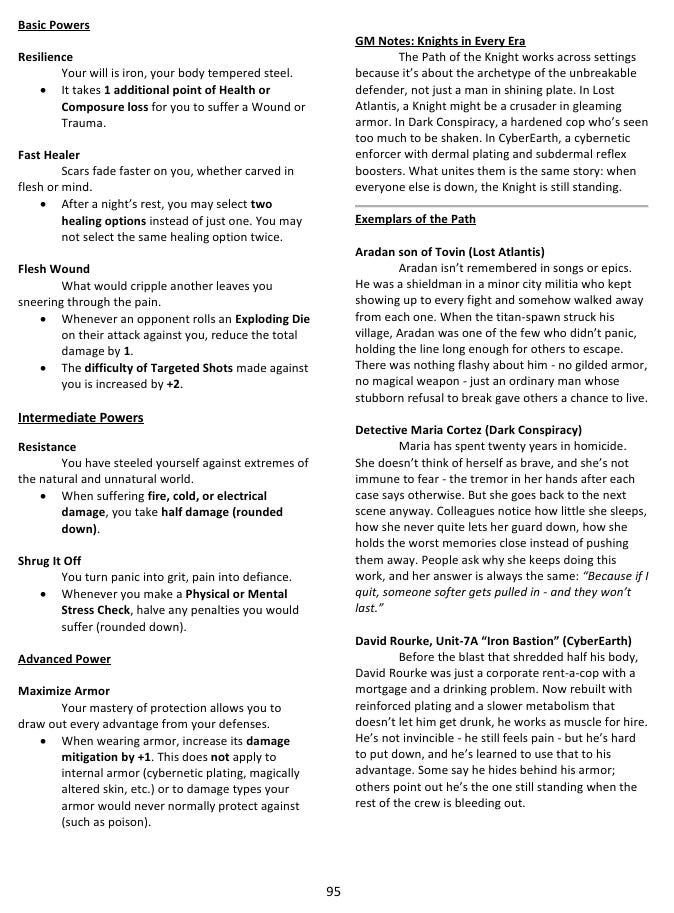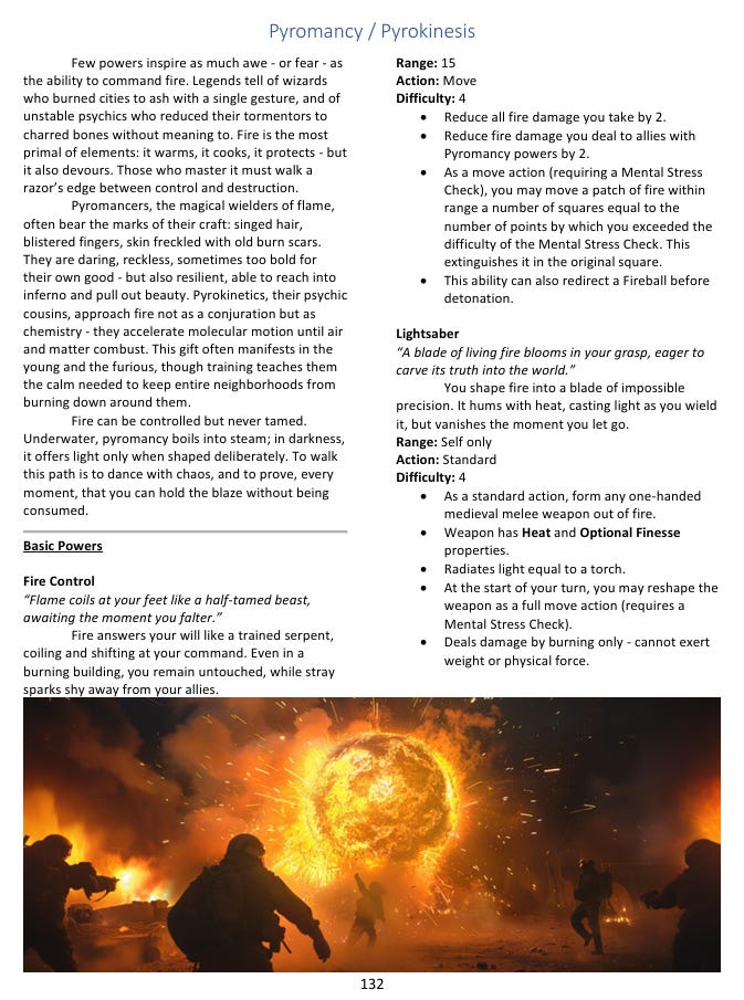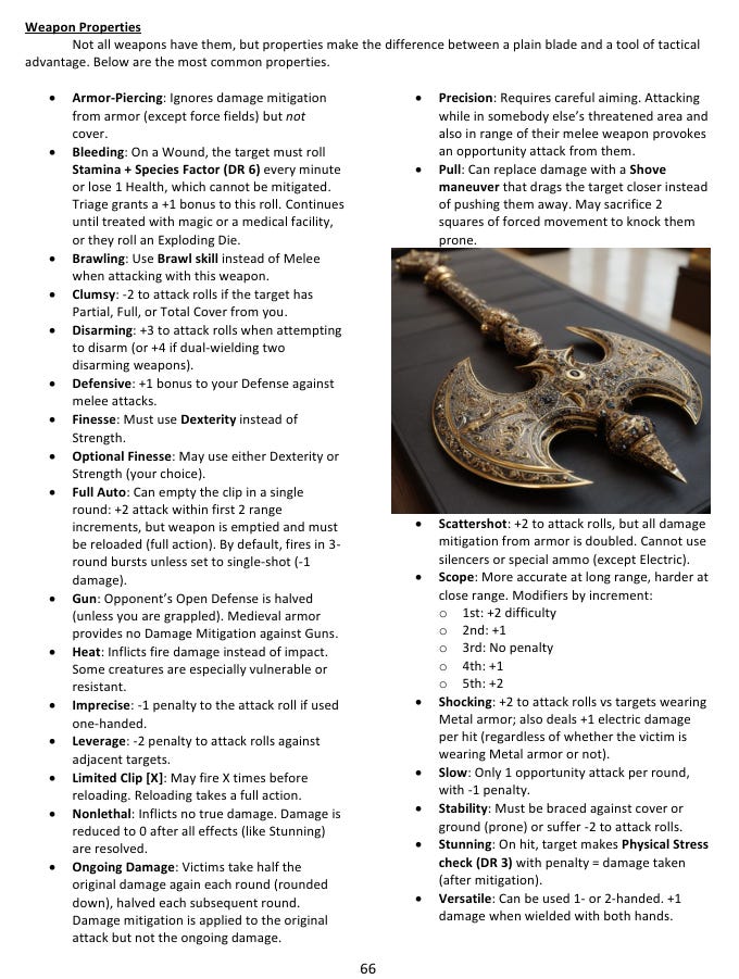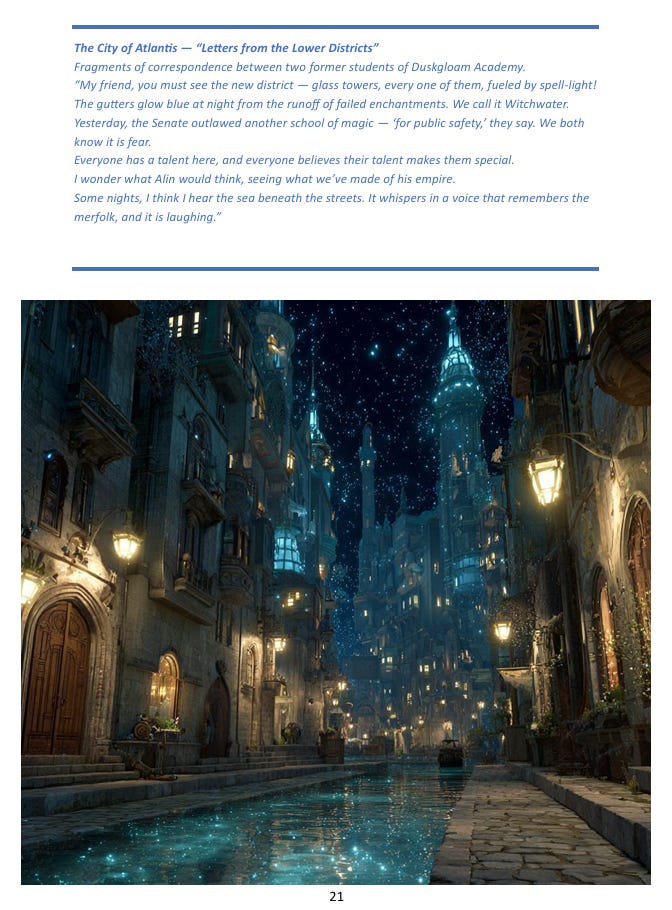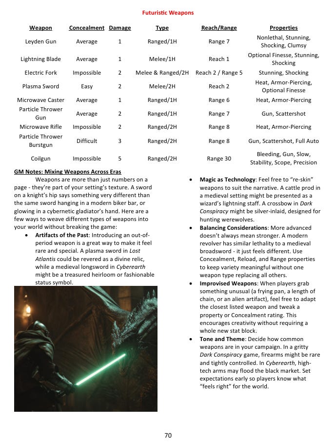 One of the things I built into the system from the start is that these settings aren’t sealed off from each other. The merfolk show up in both Lost Atlantis and CyberEarth, separated by thousands of years and transformed almost beyond recognition, but recognizably the same lineage. A relic from Lost Atlantis can become an object of obsessive study in a Dark Conspiracy campaign. You could run a cyberpunk setting where magic has returned alongside advanced technology - my book suggests the image of a dragon running a corporation as a ruthless CEO, which I find genuinely delightful. The system accommodates all of it because it’s grounded in consistent underlying logic rather than in genre conventions, and genre conventions are mostly just habits anyway.