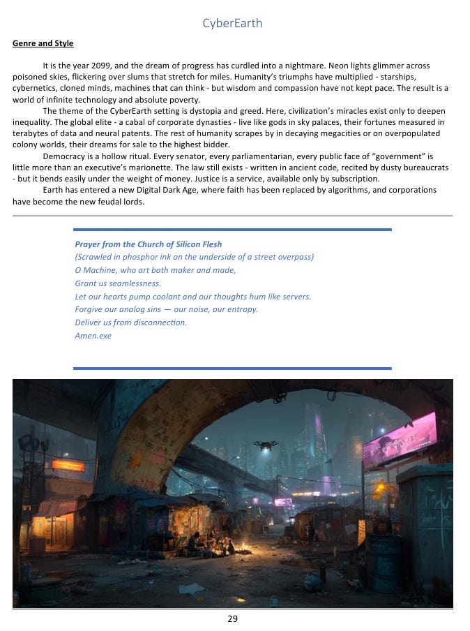 CyberEarth is set a little over seventy years from now, and I tried to make it feel like a genuine extrapolation rather than a stylistic exercise. Humanity has colonized Mars, established underwater cities on Europa, and built a pleasure colony on Titan where the low gravity lets people fly on artificial wings and every vice known to man is available for the right price. The technology is genuinely impressive. What hasn’t kept pace is everything else. Corporations have absorbed governments to the point where elections are essentially a performance - the people nominally in charge are so thoroughly owned by the dynasties behind them that the distinction barely matters. Automation has made most ordinary human labor economically worthless, and the prosperity that generates flows exclusively upward, as it tends to do.