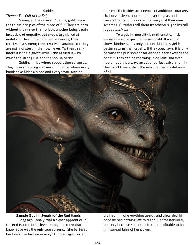 But travel away from Atlantis and something shifts. Magic doesn’t disappear exactly, but it becomes rarer, stranger, and considerably less domesticated. The people of the outer regions never had access to Atlantis’s academies and institutions, so what magic exists out there has developed along different lines - folk traditions, religious practices, things passed down in secret rather than taught in classrooms. By the time you reach the frozen north or the deep jungle, you’re in territory where a campaign can go for months without a single spell being cast, and where the occasional genuine supernatural occurrence lands with real weight precisely because it’s so unexpected. A game set in the goblin-haunted tundra or the silk-trader routes through Arachnid territory is much closer to pure sword-and-sorcery survival fiction - the swords are doing most of the work, and magic is something you encounter rather than something you use. The setting essentially gives you a dial that GMs can adjust depending on what kind of game they want to run, just by choosing where the story takes place.