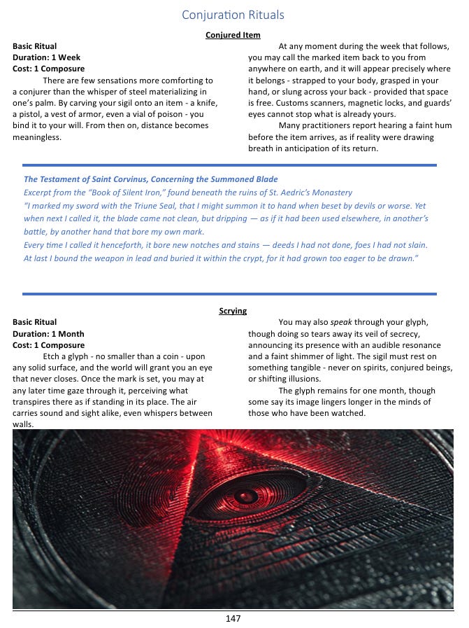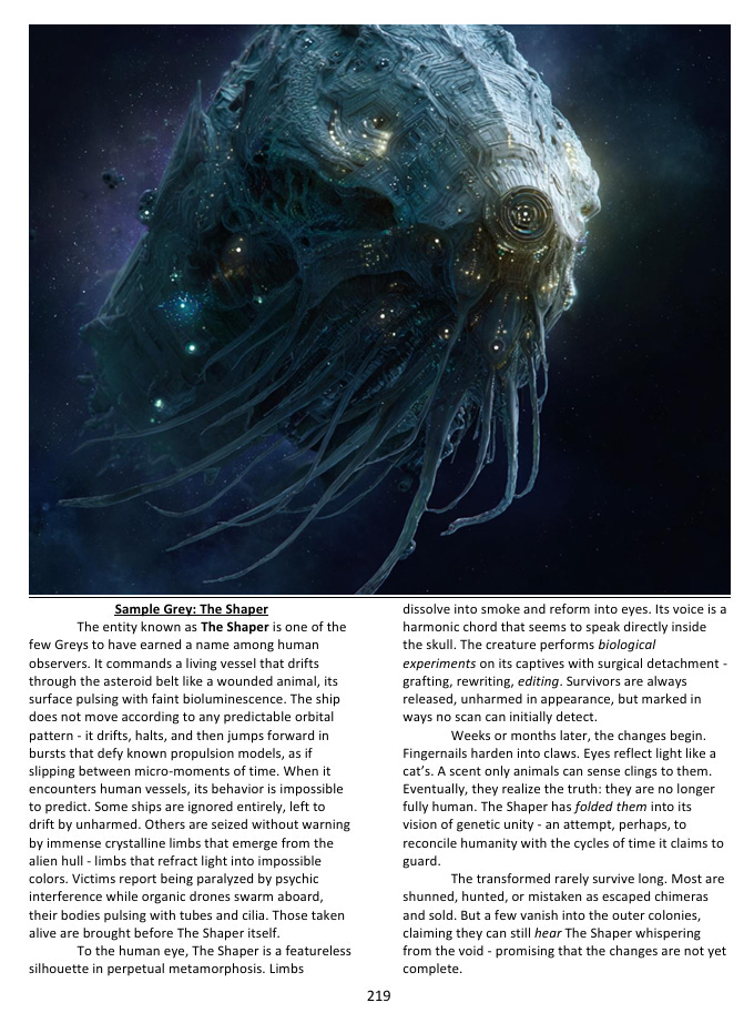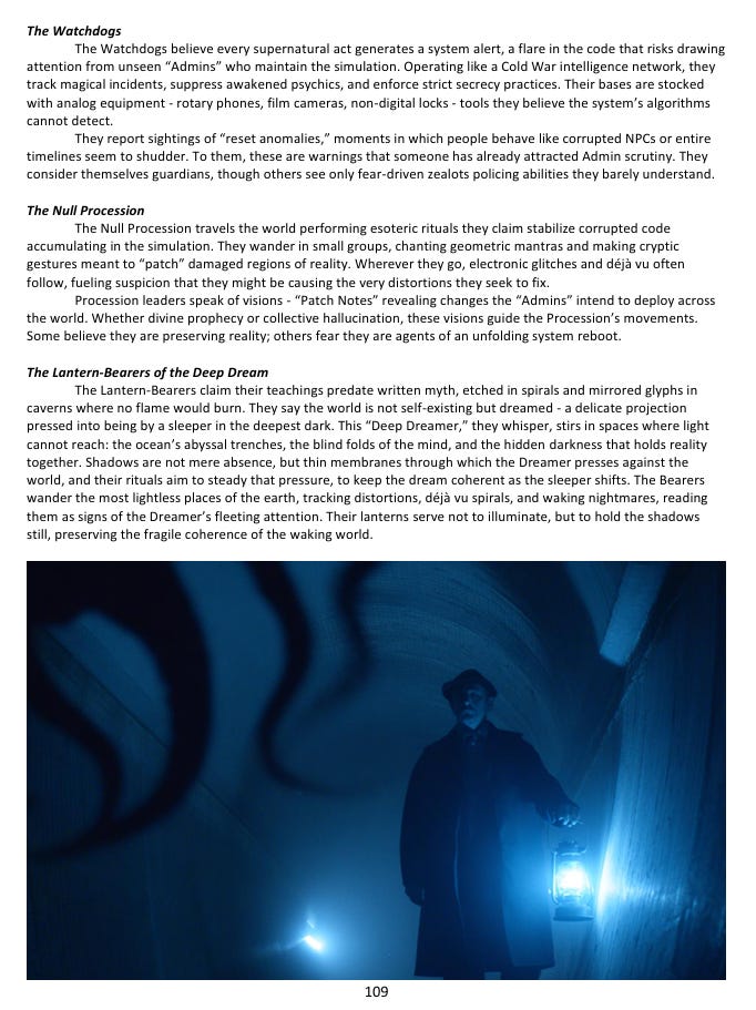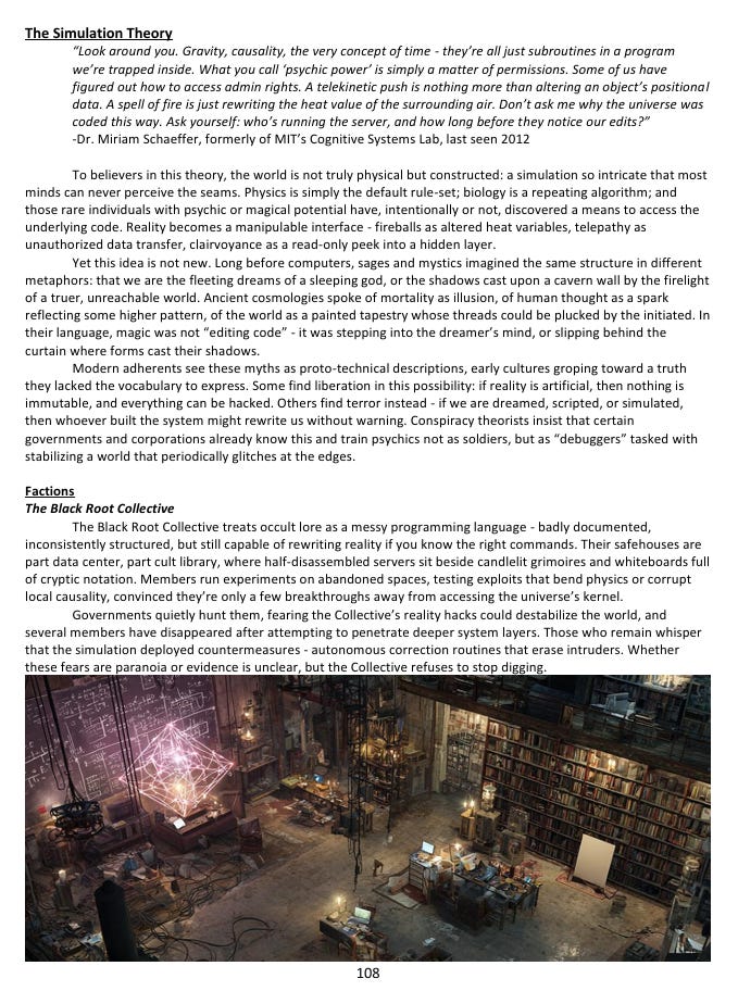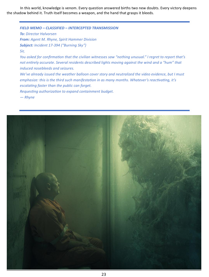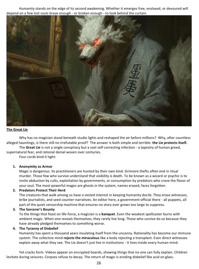The reason this has all stayed hidden is a concept I call the Great Lie - not a single organized cover-up, but a kind of self-sustaining ecosystem of concealment. The supernatural predators who live among us have obvious reasons to keep humanity unaware. Multiple government agencies are fighting covert wars over who gets to control the paranormal, which means they’re more focused on each other than on disclosure. Private corporations are running experiments on human subjects that would cause international incidents if they became public. And underneath all of it, the oldest and most powerful non-human factions have spent centuries positioning themselves to take advantage of the moment - which is apparently approaching - when all of this secrecy finally breaks down. The horror in this setting isn’t a creature leaping out of the dark. It’s the gradual, nauseating realization that everything connects, and that whatever is at the center of that web has been aware of you for much longer than you’ve been aware of it.