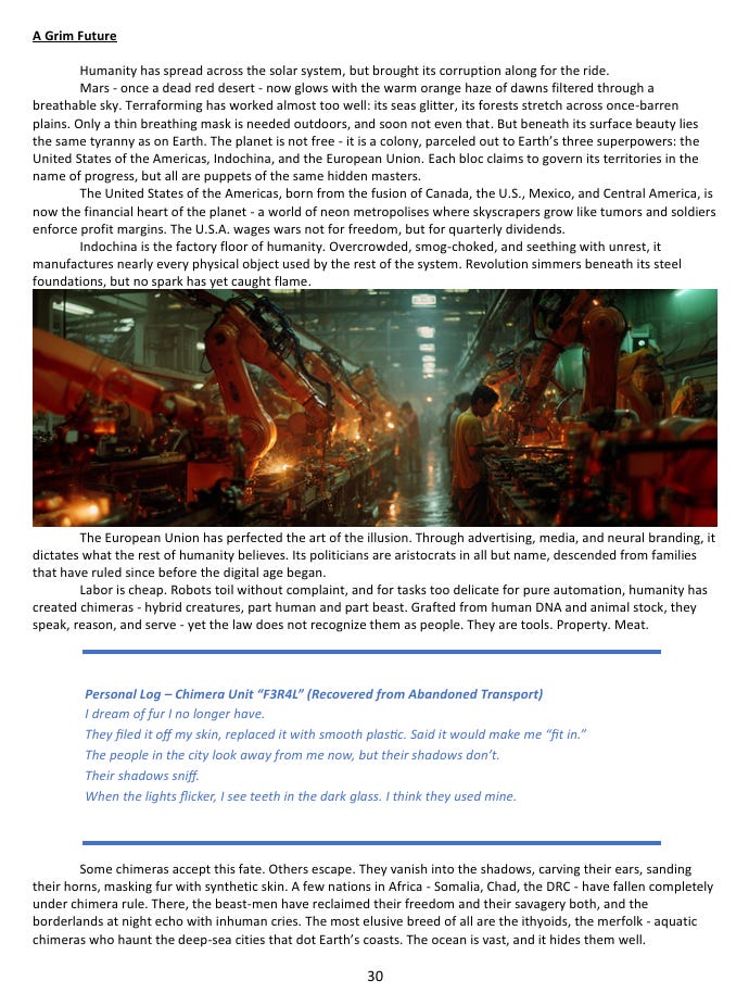 The element I find most compelling is the chimeras - beings engineered from human and animal genetic material to serve as a labor force, legally classified as property rather than people. Some have escaped that classification by disappearing into the underclass of the megacities, surgically modifying themselves to pass as human. Others have carved out actual autonomy in parts of the world where central authority has collapsed entirely. The aquatic chimeras - engineered merfolk - are the hardest to track or control, for obvious reasons. Meanwhile, out in the asteroid belt, humanity is in a state of ongoing conflict with an alien species that nobody understands - not their motives, not their biology, not what they’re ultimately trying to accomplish. Even the humans who work for them don’t know. They’re just following instructions from something that hasn’t explained itself and apparently doesn’t feel the need to.