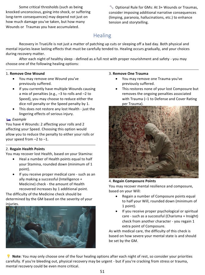 This isn’t meant to be punishing for its own sake. It’s meant to make every combat feel like something with real stakes. When your character gets into a fight in TrueLife, everyone at the table knows that even a “successful” outcome might leave them worse off than when they started. That tension changes how players think about their choices - whether to push forward or find another way, whether to stand and fight or look for an exit - in ways that make the game feel genuinely alive.
