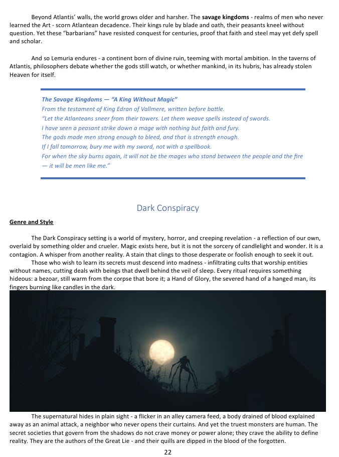 Lost Atlantis is the dark fantasy setting, but forget whatever that phrase just made you picture. No chosen heroes, no ancient prophecies, no sweeping battles between the forces of light and darkness. The closest comparison I can make is Robert E. Howard’s Conan stories - a world where violence is fast and ugly, where the intelligent response to most threats is to not be there when they arrive, and where even a seasoned warrior can be killed by someone he would have considered beneath his notice. The continent of Lemuria has a creation myth involving a war between gods and titans that left the land itself as a kind of divine wreckage - and that sense of something sacred having gone wrong a long time ago permeates the whole setting. You’re not walking through a world in the middle of its heroic age. You’re walking through the aftermath of one.